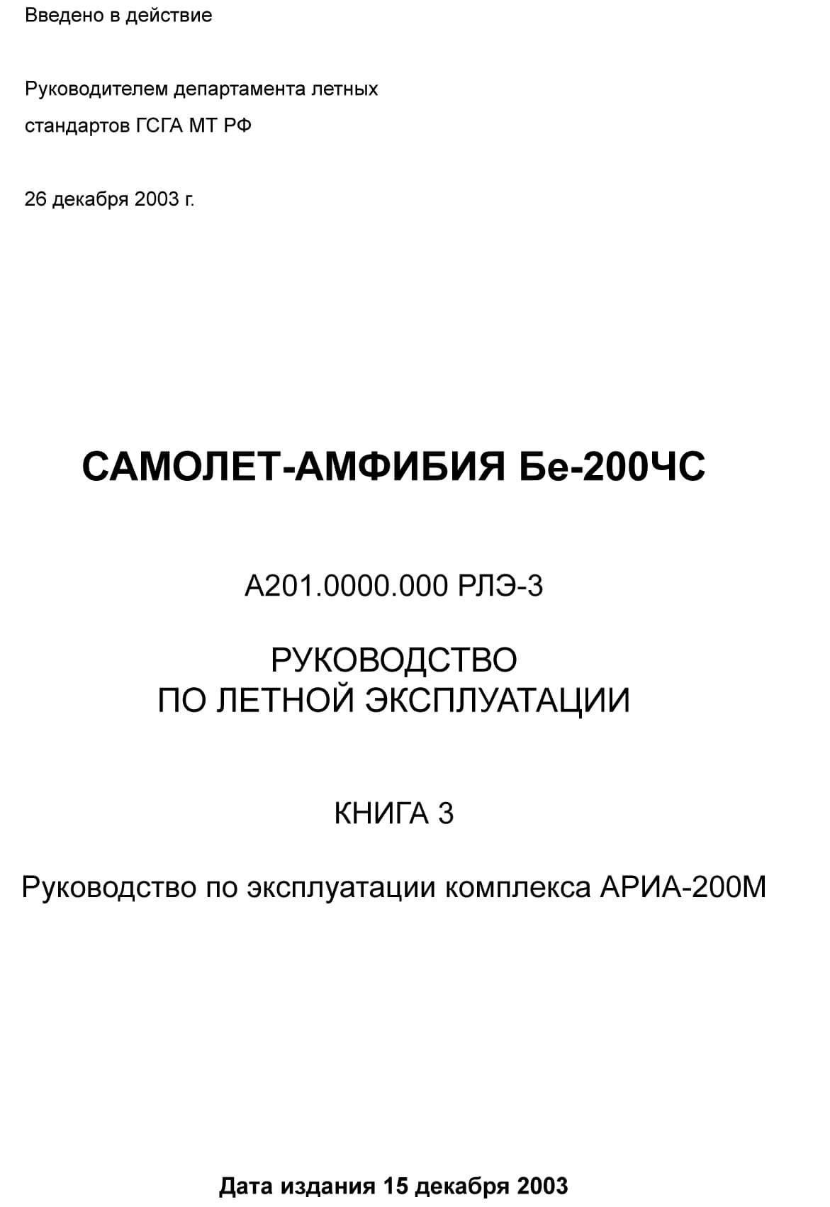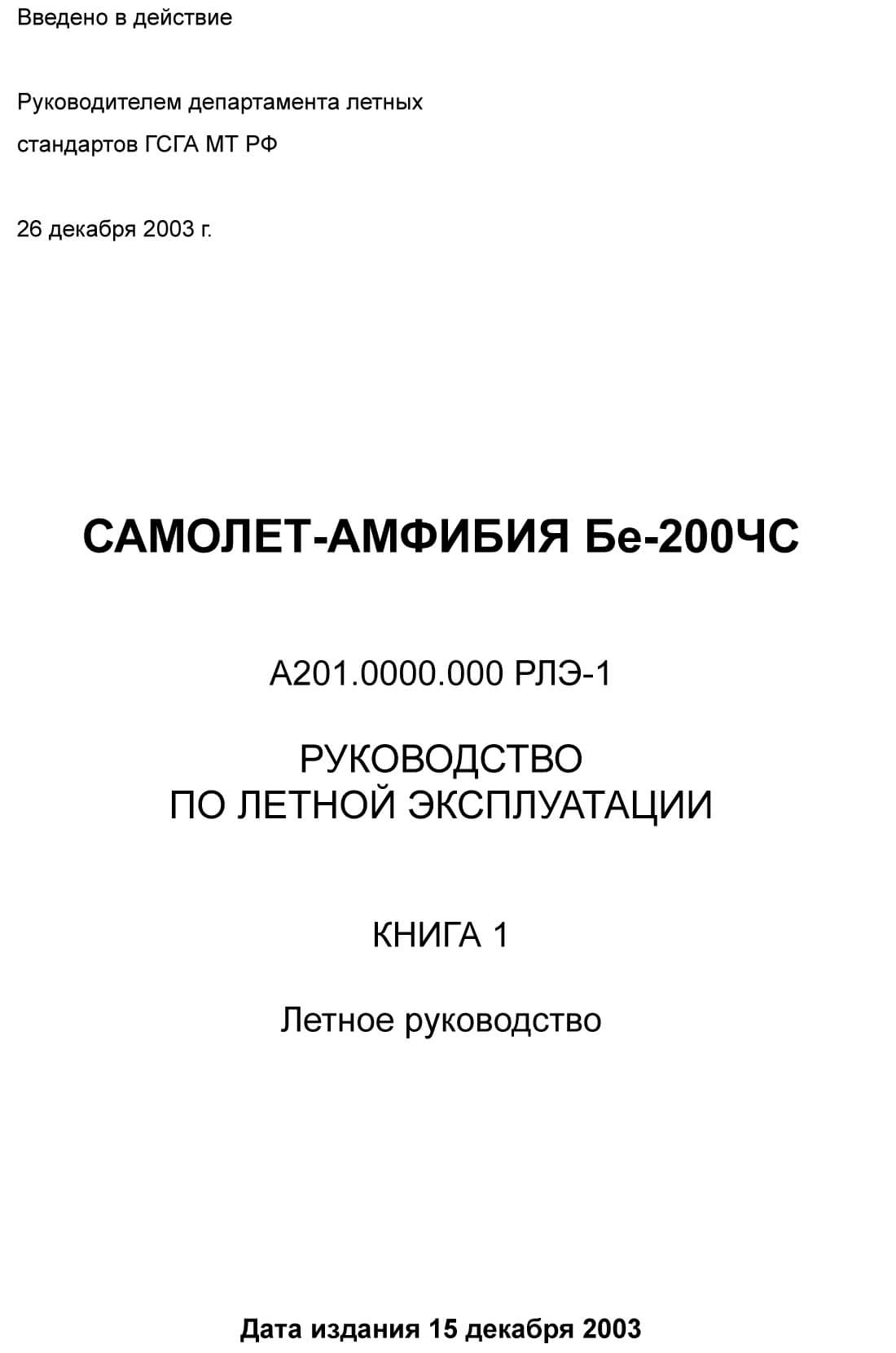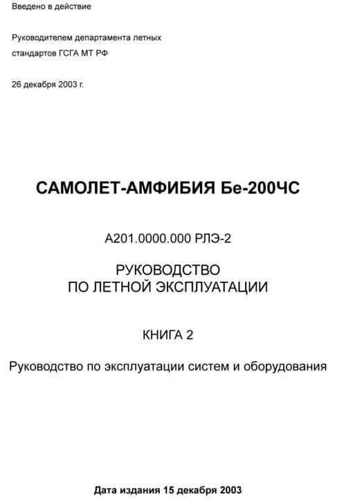 - Flight Manual for the BE-200ES amphibian aircraft, IN THE RUSSIAN LANGUAGE. Titled “Management of the Flight Operations”, it comprises three volumes all dated 26-12-2003: