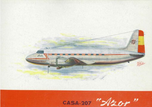 The CASA 207 Azor was a 40 passenger transport aircraft, scaled up from the earlier CASA Halcon aircraft, which first flew in 1955. Although intended for the civil market, it was an old-fashioned design and there was no civil interest. The Spanish Air Force stepped up and ordered 10. The 10 aircraft were configured as passenger transport aircraft and replaced types such as the Ju52 in Spanish Air Force service. A further 10 aircraft were ordered, configured in the paratroop and cargo configuration. Known as the T-7 in Spanish Air Force service, the fleet soldiered on until retirement in the early 1980’s.