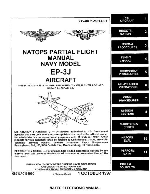 • US Navy NATOPS Partial Flight Manual for the EP-3J, NAVAIR 01-75PAA-1.3 dated 1-10-97, with approx. 245 pages.