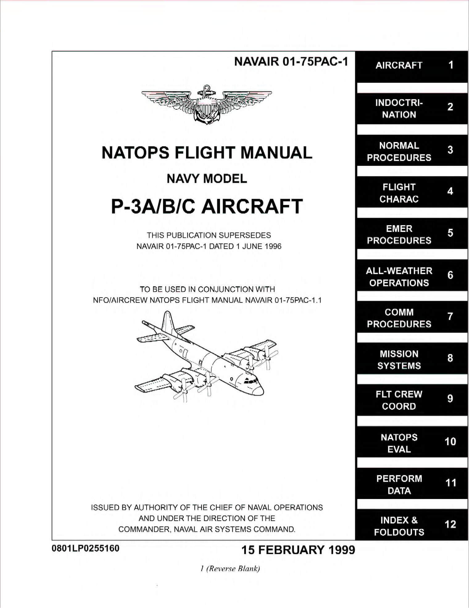 • US Navy NATOPS Flight Manual for the P-3C, NAVAIR 01-75PAC-1 dated 1-8-2007, with approx. 1,143 pages