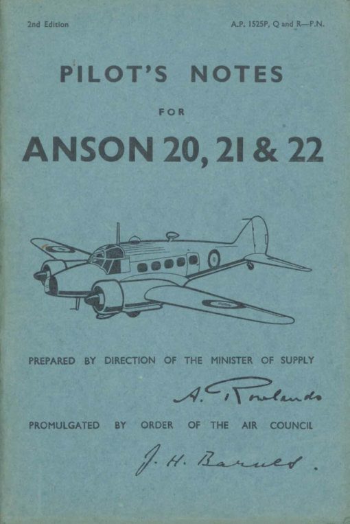 - RAF Pilot’s Notes for the Anson 20,21,22, AP 1525P,Q,R-PN, 2nd Edition dated August 1952 with approx. 47 pages.