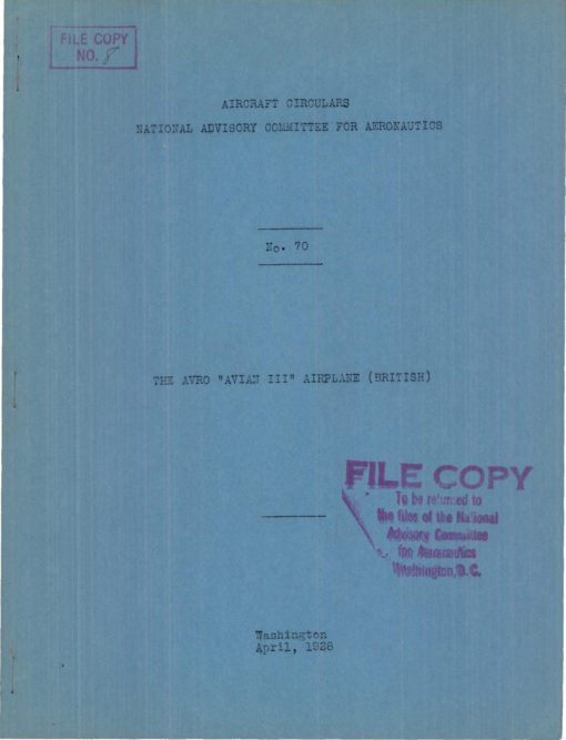 - NACA Aircraft Circular No 70 covering the “Avro Avian III” (ADC Cirrus engine), dated October 1928 with approx. 8 pages.