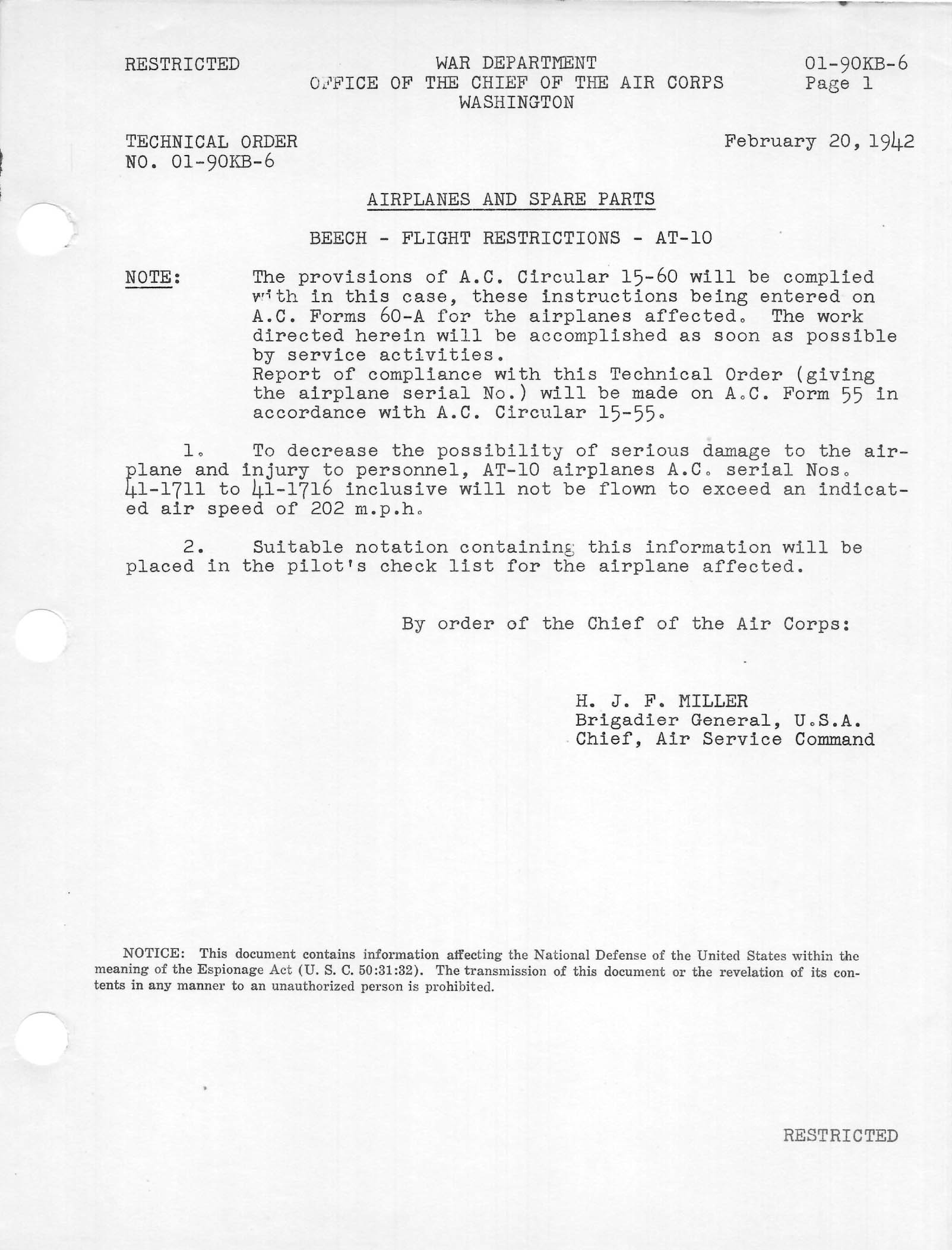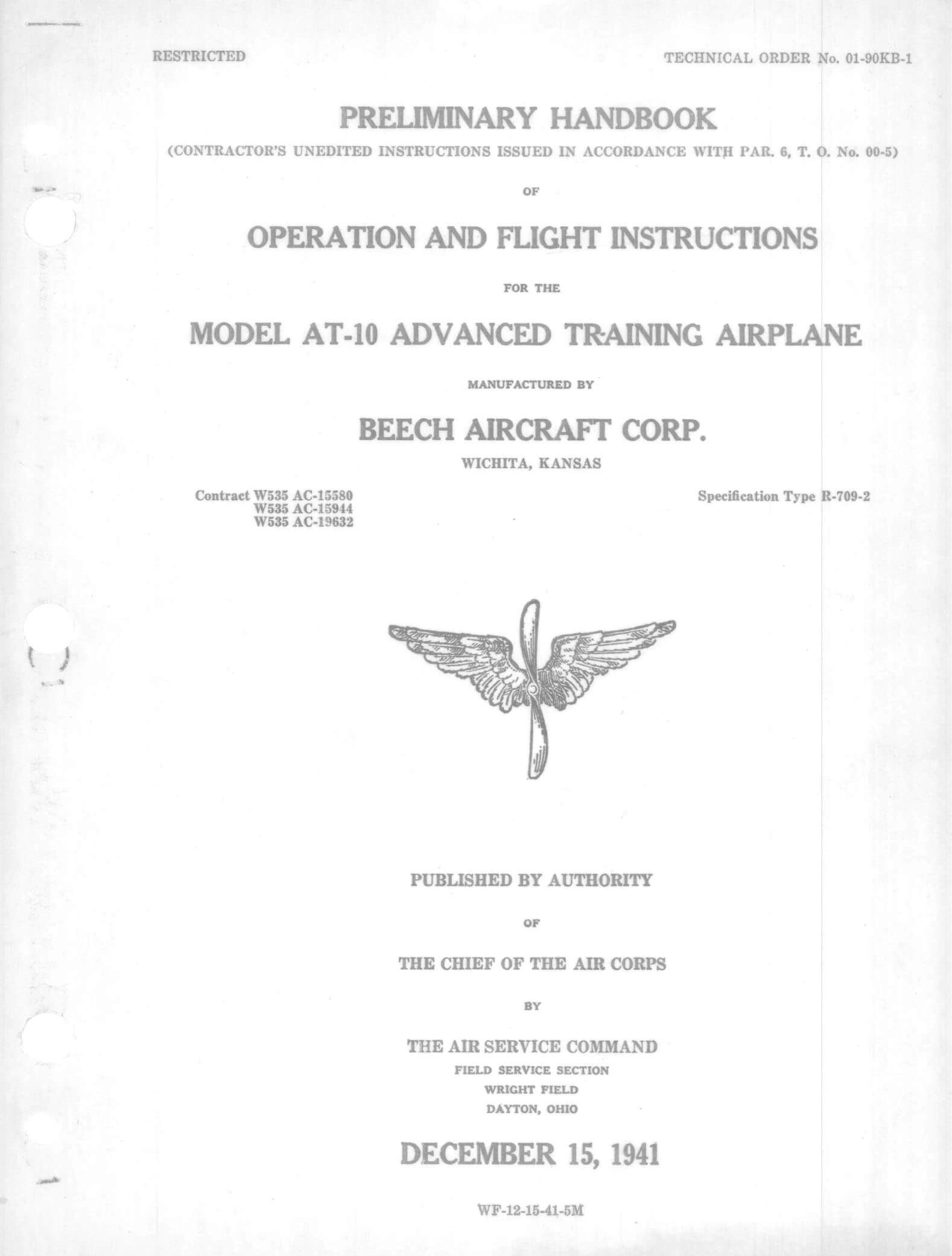 - USAAF Preliminary Handbook of Operating and Flight Instructions for the AT-10, Tech Order No 01-90KB-1 dated 15-12-41, with approx. 24 pages.