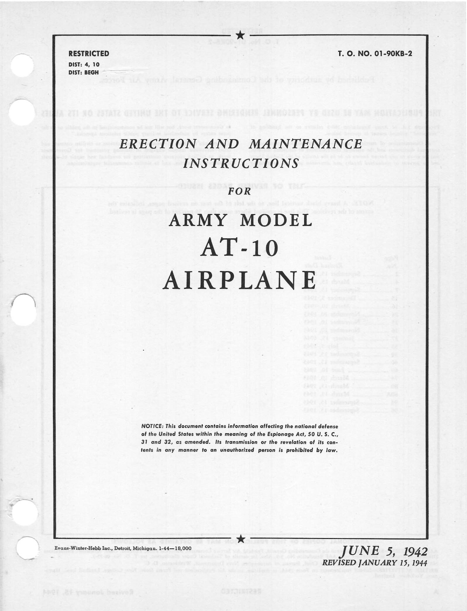 - USAAF Erection and Maintenance Instructions for the AT-10, Tech Order No 01-90KB-2 dated 5-6-42 revised to 15-1-44, with approx. 112 pages.