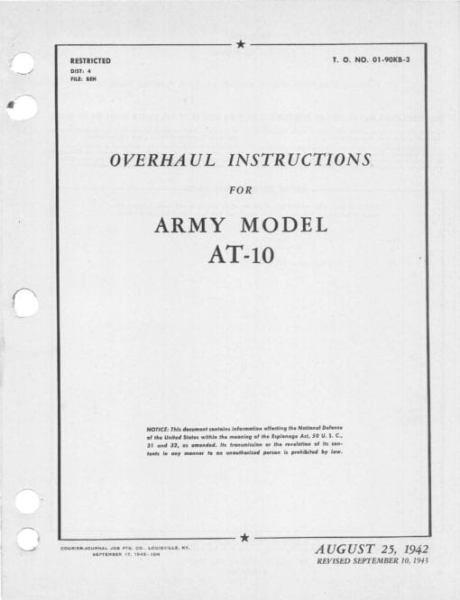 - USAAF Overhaul Instructions for the AT-10, Tech Order No 01-90KB-3 dated 25-8-42 revised to 10-9-43, with approx. 72 pages.