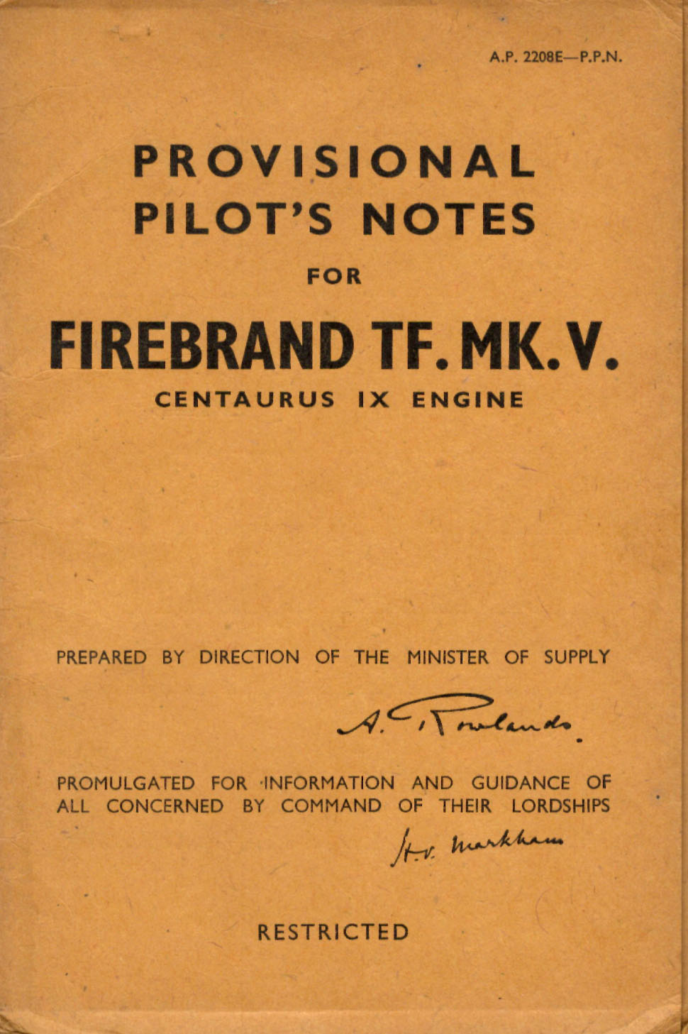 This title includes two flight manuals (titled Pilot’s Notes) for the Firebrand TF.V plus reprinted magasine technical articles on the Firebrand IV. The files have been scanned from the original flight manuals and retain any colour pages.