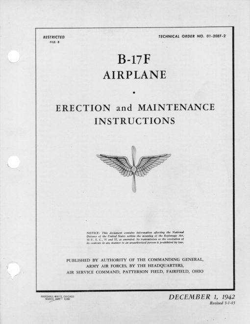 - USAAF Erection and Maintenance manual for the B-17F airplanes, AN 01-20EF-2, dated 1-12-42 revised to 1-3-43 with approx. 508 pages.