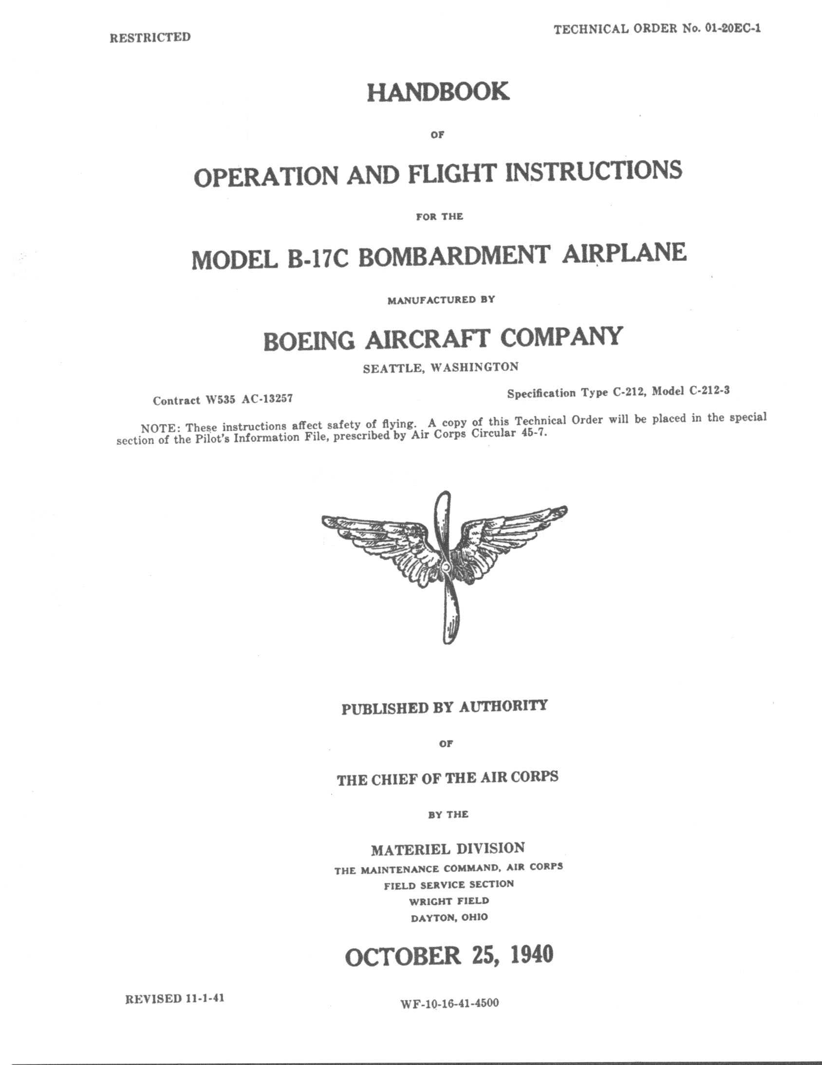 - USAAF Handbook of Operating and Flight Instructions for the B-17C airplane, Technical Order No 01-20EC-1 dated 25-10-40 revised to 11-1-41 with approx. 78 pages. (Scanned from a photocopy).