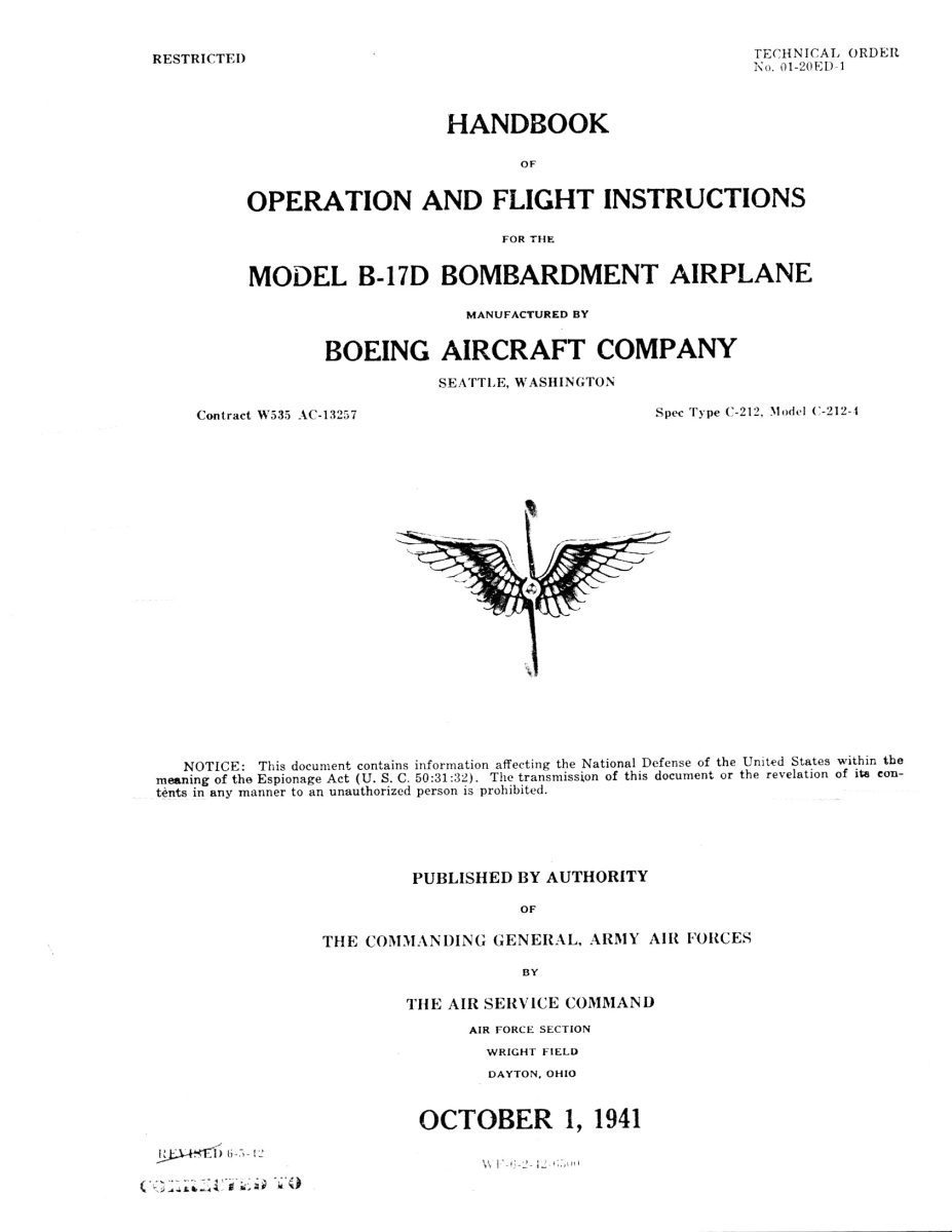 - USAAF Handbook of Operating and Flight Instructions for the B-17D airplane, Technical Order No 01-20ED-1 dated 1-10-41 with approx. 97 pages. (Scanned from a photocopy).