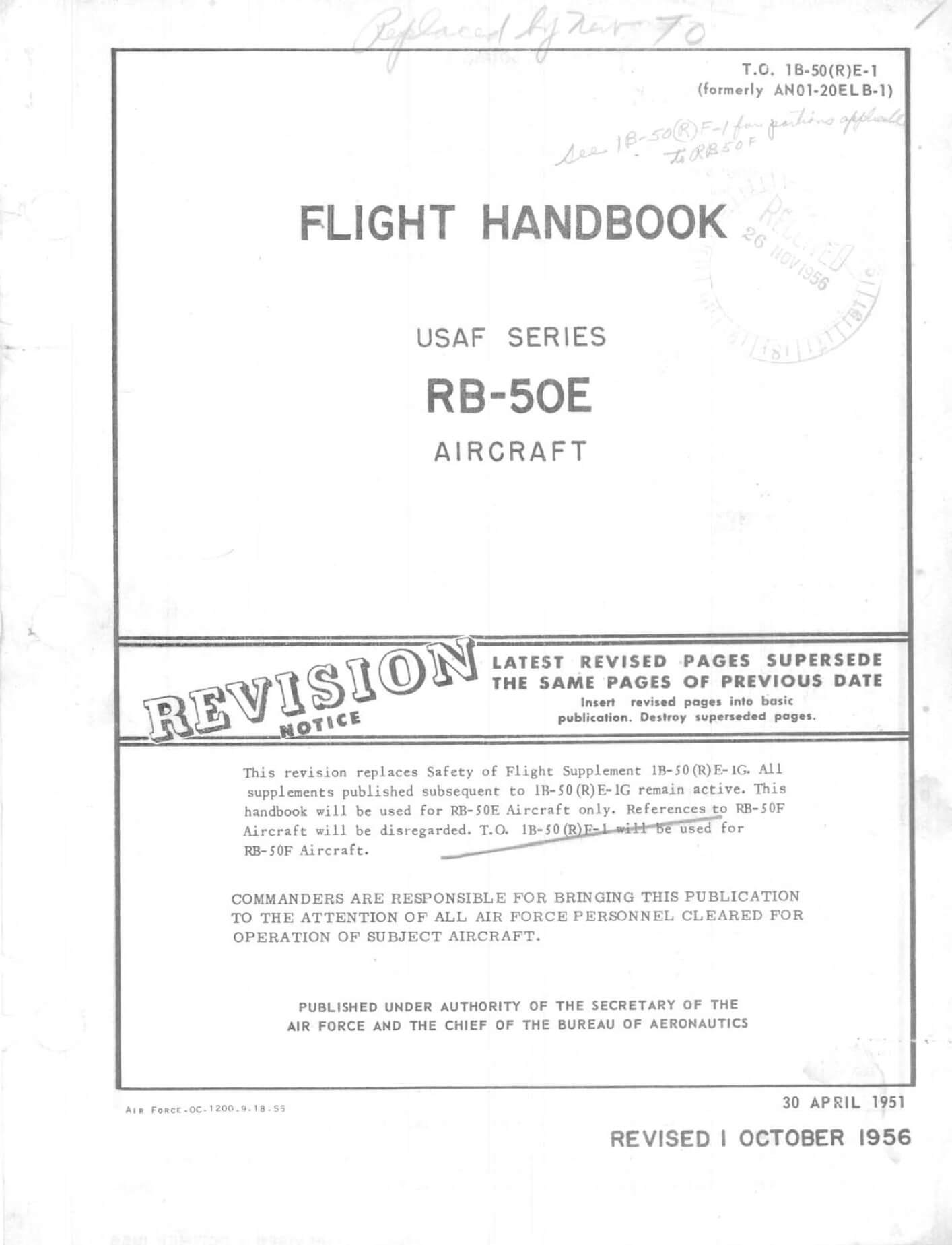 - USAF Flight Handbook for the RB-50E, T.O. 1B-50(R)E-1 dated 30-4-51 revised to 1-10-56, with approx. 376 pages.