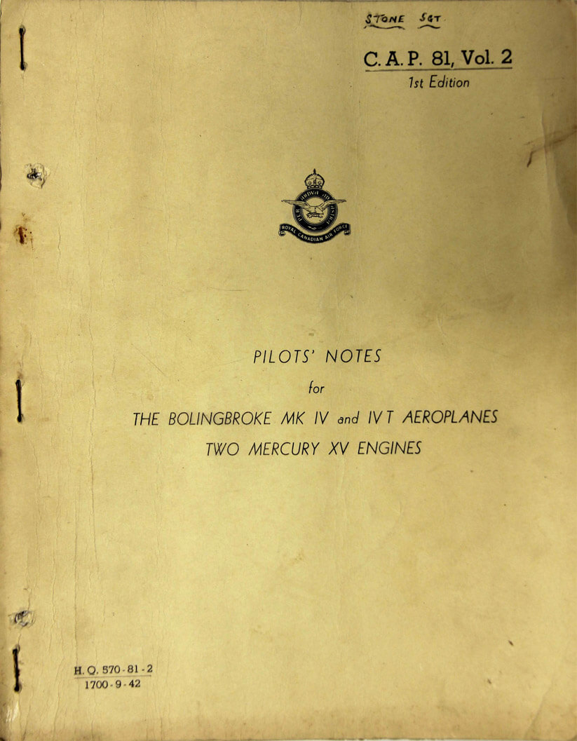 - RCAF Pilot’s Notes for the Bolingbroke IV, CAF Publication 81 Vol 2 dated September 1942 with approx. 39 pages. (Unfortunately, incomplete. The last 12 paragraphs of Section II are missing, but still extremely rare.)