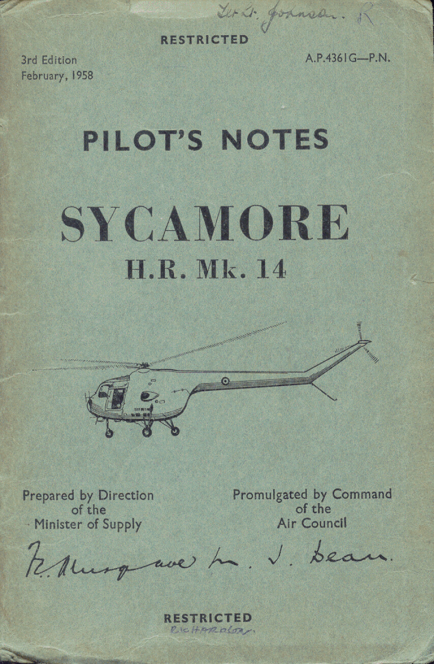 - RAF Pilot’s Notes for the Bristol Sycamore HR.Mk.14, AP 4361G-PN dated Feb 58, approx. 56 pages.