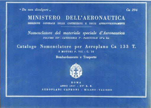 - Italian Ministry of Defence manual titled “Catalogo Nomeclatore” (Parts Catalog) for the Caproni Ca 133 T, document reference C.A. 294 dated 1937 with approx. 404 pages. (In the Italian language.)