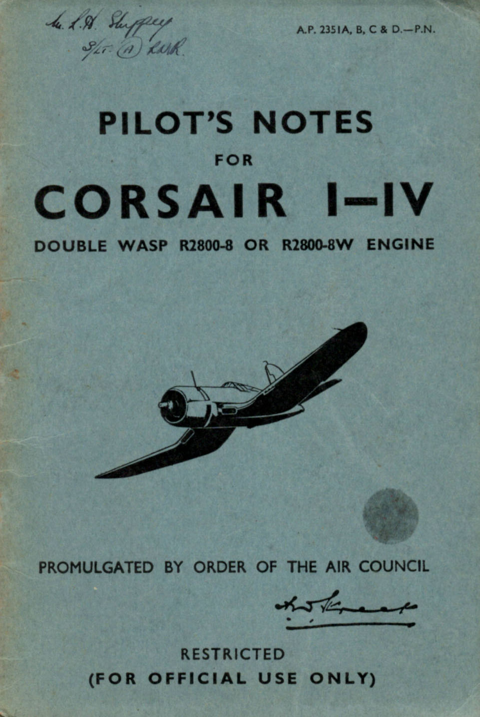 - RAF Pilot’s Notes for the Corsair I to IV, AP 2351A to D-PN dated Aug 1944 with approx 40 pages.