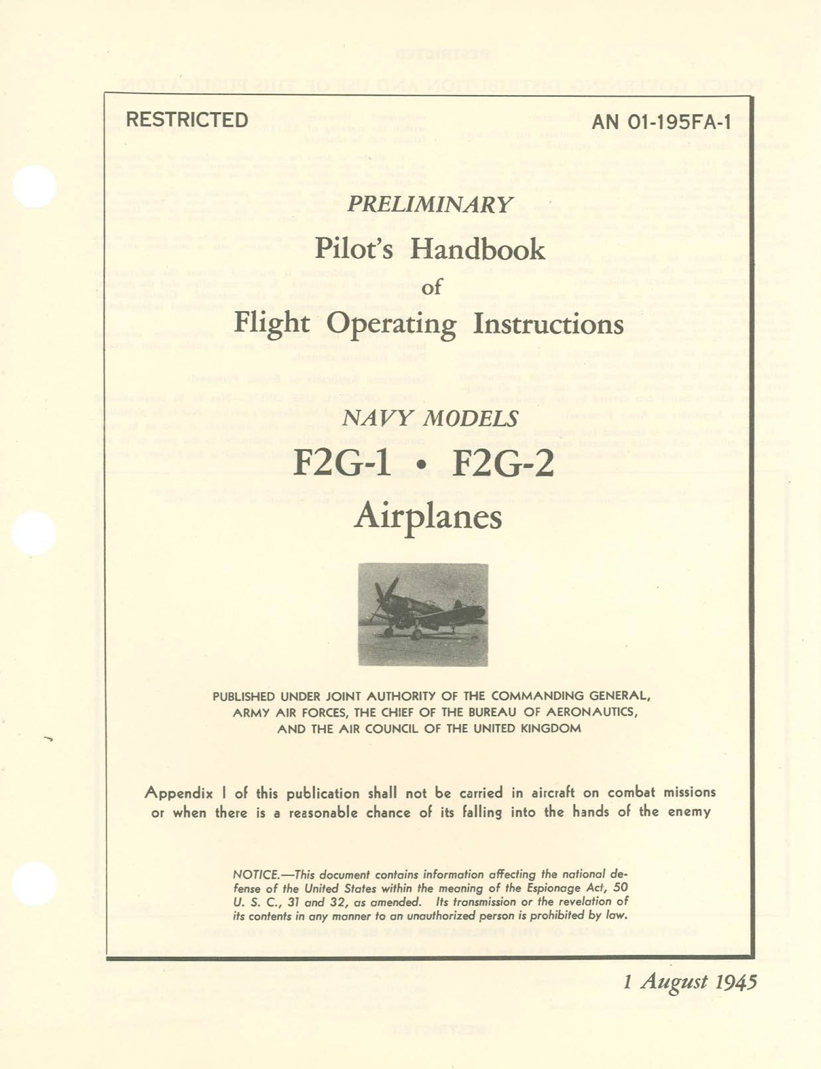 - US Navy Preliminary Pilot’s Handbook for the F2G-1 and F2G-2, AN 01-195FA-1 dated 1-8-45 with approx. 77 pages.