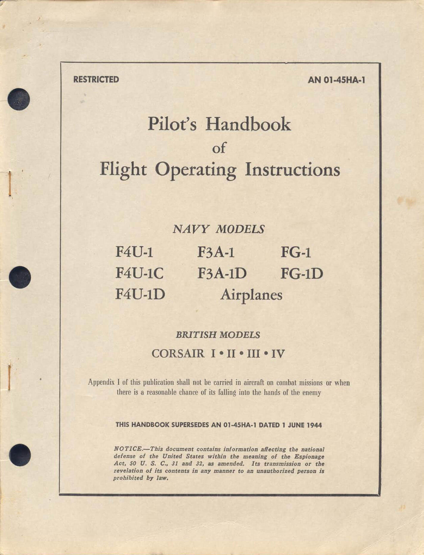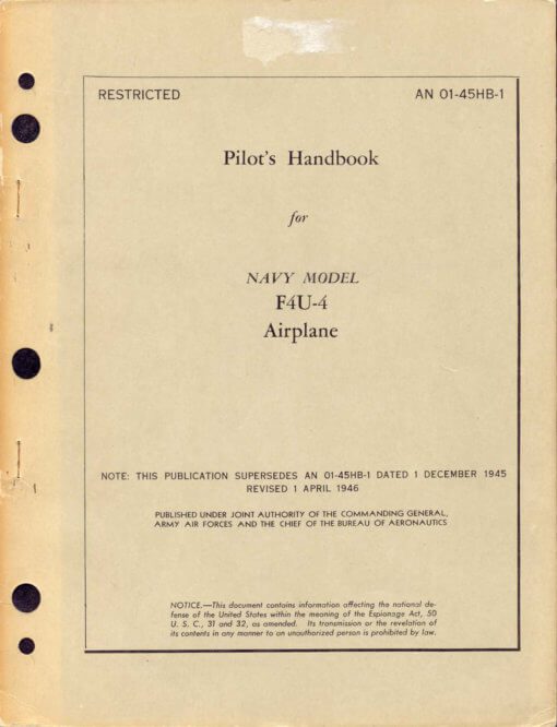 - US Navy Pilot’s Handbook for the F4U-1 F4U-1C F4U-1D F3A-1 F3A-1D FG-1 FG-1D, AN 01-45HA-1 dated 15-3-45, with approx. 64 pages.