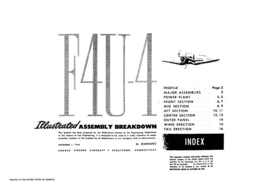 - Manufacturer’s Illustrated Assembly Breakdown (a manufacturing aide) for the F4U-4, dated 1-9-44 with approx. 16 pages.