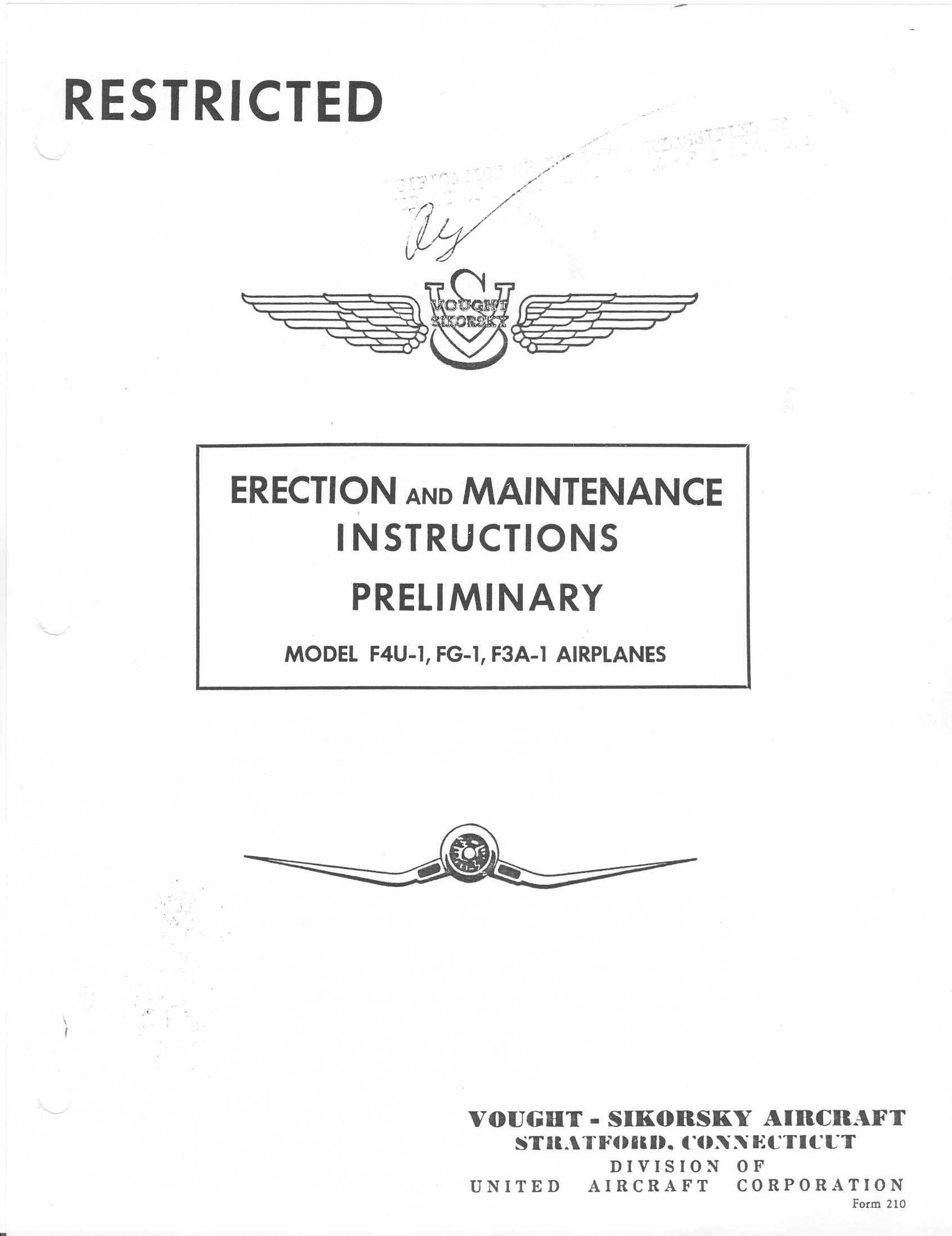 - Manufacturer’s Preliminary Erection and Maintenance Instructions for the F4U-1, F3A-1, FG-1, Vought-Sikorsky report 5562 dated 9-7-42 with approx. 208 pages.