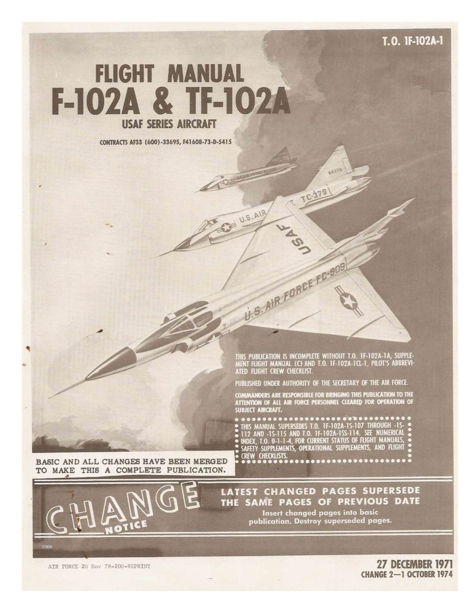 This title contains two USAF flight manuals for the F-102, an early one on the single-seat F-102A and a later one covering both the single-seat and the twin-seat TF-102 Delta Dagger, both including performance data, along with an early manufacturer’s Flight Training Manual for the F-102A. The files have been scanned from the original flight manuals and include any colour pages.