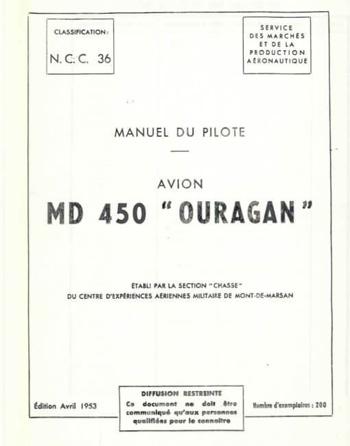 - Armee de l’Air Manuel du Pilote for the M.D.450 Ouragan, the French flight manual, document N.C.C.36 dated April 1953 with approx. 102 pages. Scanned from a photocopy. (In French.)