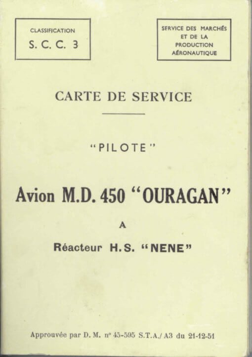 - Armee de l’Air Carte De Service “Pilote” for the M.D.450 Ouragan. This is a 14 page multiple fold-out pilot flight manual, document S.C.C.3 dated 21-12-51 with approx. 14 pages. (In French).