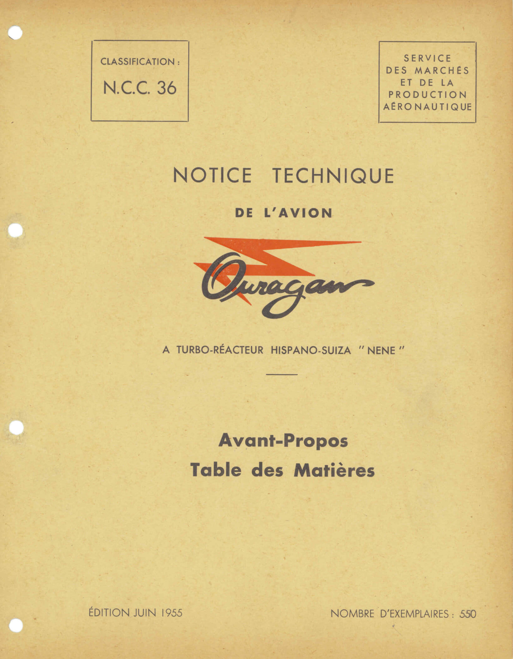 - Maintenance Manual for the Ouragan, titled “Notice Technique”. In the standard early 50’s French military format including description, maintenance, weight data, dismantling, etc. Document N.C.C. 36 dated June 1955 with approx. 440 pages. (In French.)