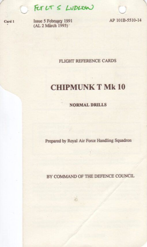 - RAF Pilots Checklist, titled Flight Reference Cards, for the Chipmunk T.10. AP 101B-5510-14 at Issue 5 dated 5 February 1991 with approx. 22 pages.
