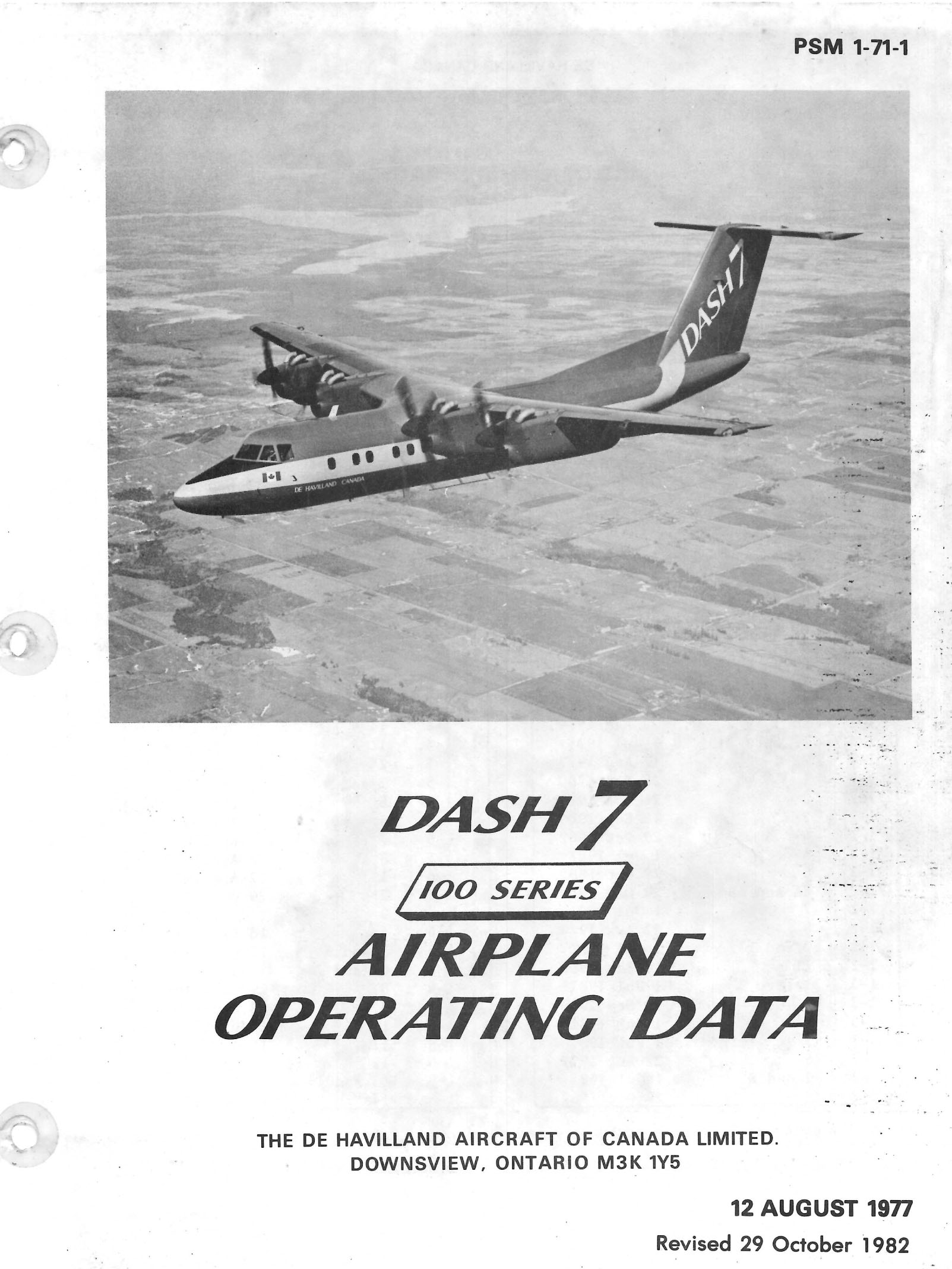 This title contains the manufacturer’s flight manual (Titled Operating Data Manual) for the DHC-7 Dash7 along with two manufacturer’s descriptive publicity brochures. The files have been scanned from the original flight manuals and retain any colour pages.