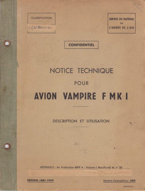 - Armee De L’Air Notice Technique (Technical Manual) for the Vampire F.1, dated May 1949 with approx. 164 pages. (French text followed by illustrations from British AP4099A-Vol One.)