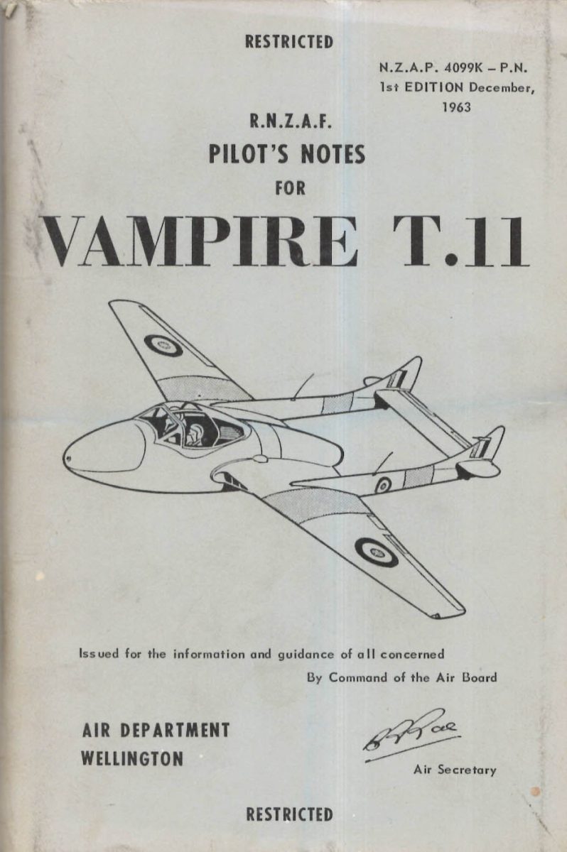 - RNZAF Pilot’s Notes for the Vampire T.11, RNZAF Publication NZAP 4099K-PN 1st Edition dated Dec 1963, with approx. 75 pages