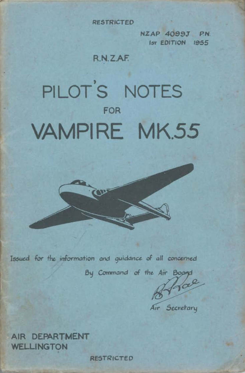 - RNZAF Pilot’s Notes for the Vampire T Mk 55, NZAP 4099J-PN, 1st edition dated 1955 with approx. 50 pages.