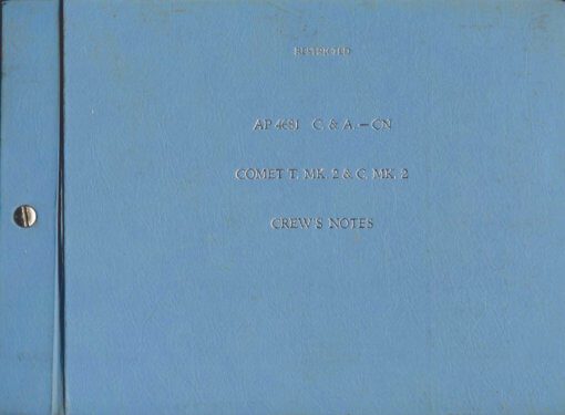 - RAF Crew’s Notes for the Comet T.2 and C.2, AP 4681C & A-PN, with approx. 493 pages. (A manufacturer’s publication given a military AP number). The 10 Comet C.2 aircraft were re-built Comet 1’s incorporating lessons learnt from the tragic accidents of the early Comet 1’s. Two examples of the T.2 were similar but lacked the strengthened floor and were only used for training.