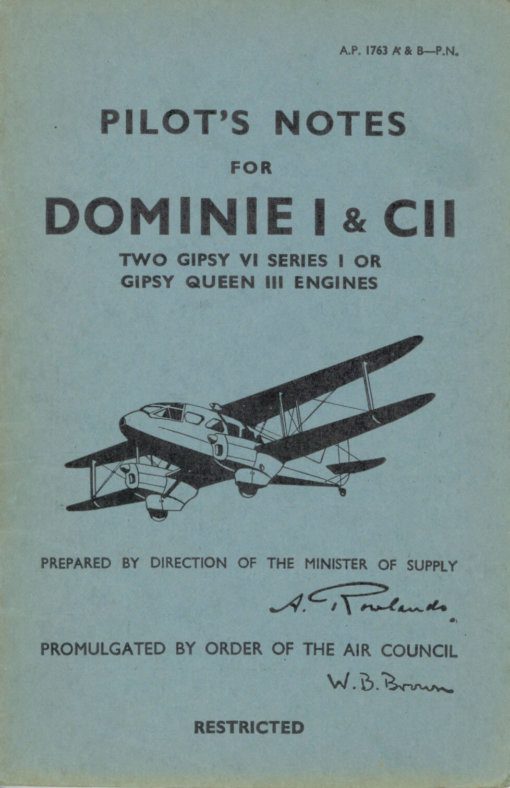- RAF Pilot’s Notes for the Dominie I and CII, AP 1763A & B-PN, dated September 1946, with approx. 20 pages.