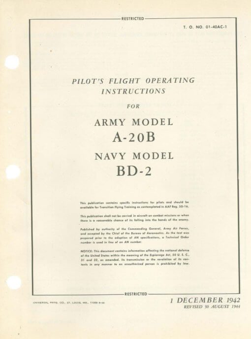 - USAAF Pilot’s Handbook of Operation and Flight Instructions for the A-20B BD-2, AN 01-40AC-1 dated 1-12-42, revised to 30-8-44 with approx. 74 pages.