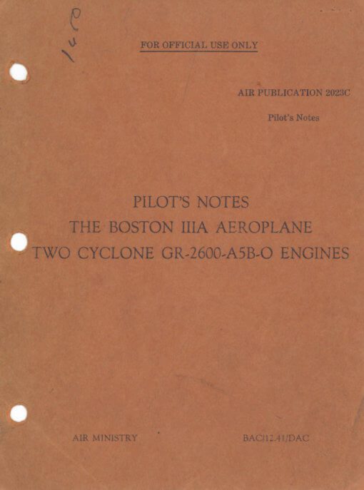- RAF Pilots Notes for the Boston IIIA, Air Publication 2023C Pilots Notes dated December 1941 with approx. 82 pages.