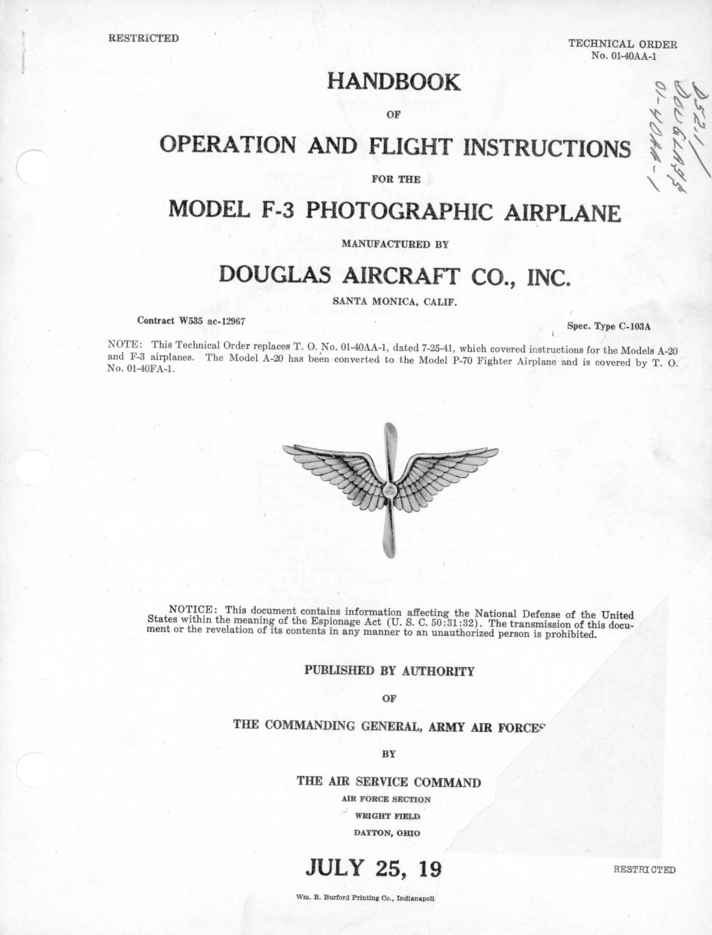 - USAAF Pilot’s Handbook of Operation and Flight Instructions for the F-3 Photographic Airplane, Technical Order No 01-40AA-1 dated 27-7-41 with approx. 32 pages.