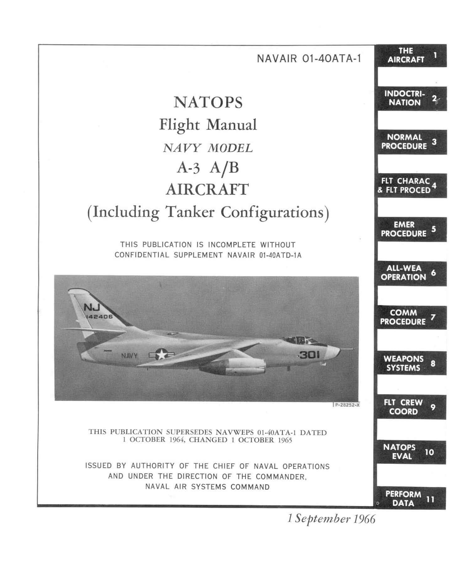 - US Navy NATOPS Flight Manual for the A-3A/B, NAVAIR 01-40ATA-1 dated 1-9-66, with approx. 738 pages.