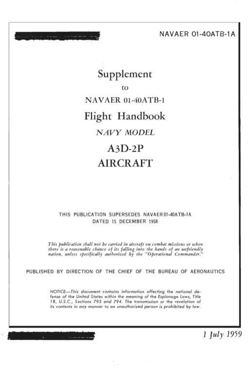 - US Navy Supplemental Flight Handbook for the A3D-2P, NAVWEPS 01-40ATB-1A dated 1-7-59, with approx. 130 pages.