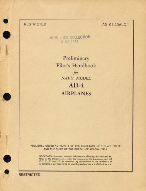 - US Navy Preliminary Pilot’s Handbook for the AD-4, AN 01-40ALC-1 dated 1-7-49, with approx. 57 pages. (The AD-4 was a single-seat version fitted with the more powerful 2,700 hp R-3350-26WA engine.)