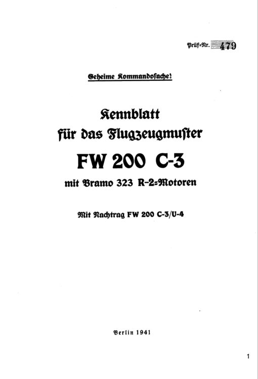 - Luftwaffe Bedienungsvorschrift-Fl (Pilot’s Manual) for the Focke-Wulf Fw200C-3, document L.Dv.T. 2200C-3/fl dated Feb 1941 with approx. 123 pages. (In the German language.)