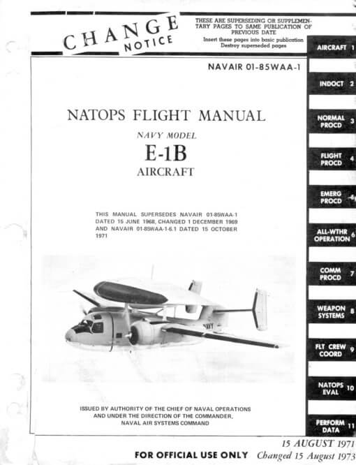 - US Navy NATOPS Flight Manual for the E-1B, NAVAIR 01-85WAA-1, dated 15-8-71 revised to 15-8-73 with approx. 362 pages.