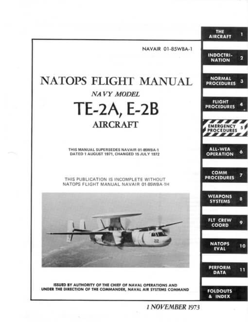 - US Navy NATOPS Flight Manual for the TE-2A, E-2B, NAVAIR 01-85WBA-1, dated 1-11-73, with approx. 486 pages.