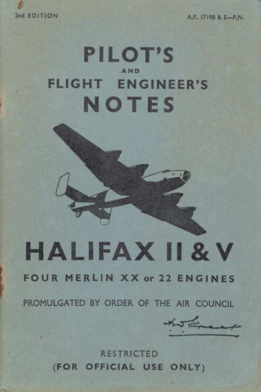 - RAF Pilot’s Notes for the Halifax II and V, AP 1719B and E-PN 2nd Edition dated Jan 1944 with approx. 72 pages.