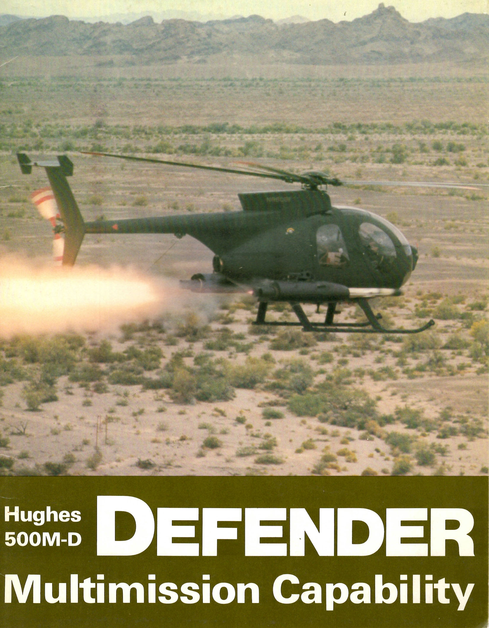 - Hughes manufacturer’s colour brochure for the Hughes 500M-D Defender, undated with approx. 8 pages.