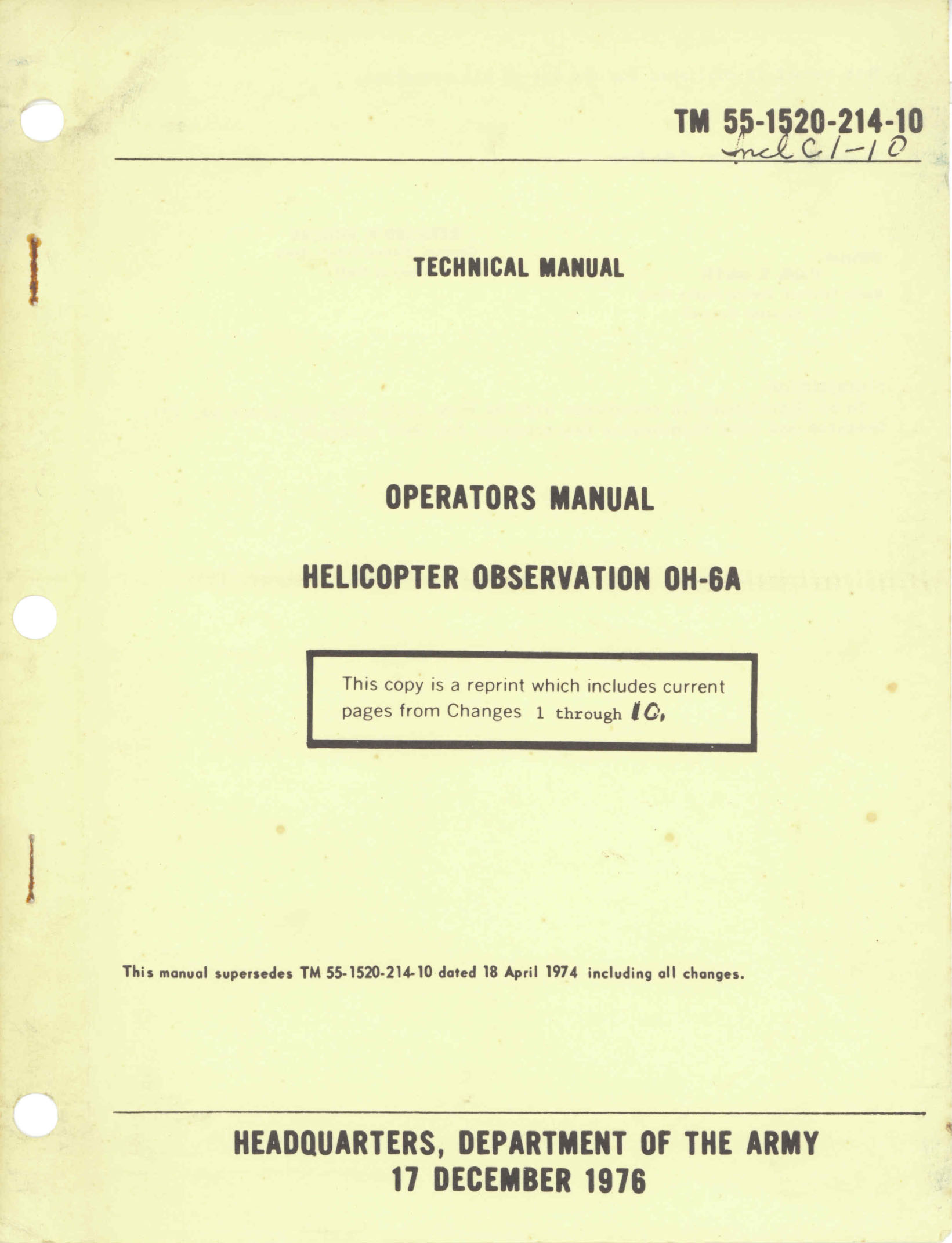 - US Army Operator’s Manual for the OH-6A helicopter, TM 55-1520-214-10 dated 17 December 1976 with approx. 201 pages.