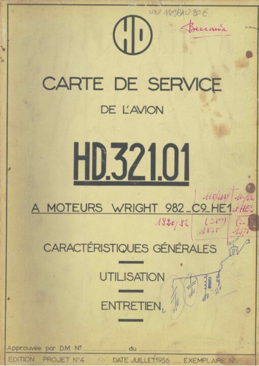 - Manufacturer’s Carte De Service De L’Avion HD.321.01 (the version of the HD.32 series with Wright 982 engines). A complete manual comprising “Caracteristiques Generales (specification), Utilisation (Operation) and Entretien (maintenance)” dated July 1956 with approx. 52 pages. In the FRENCH language.