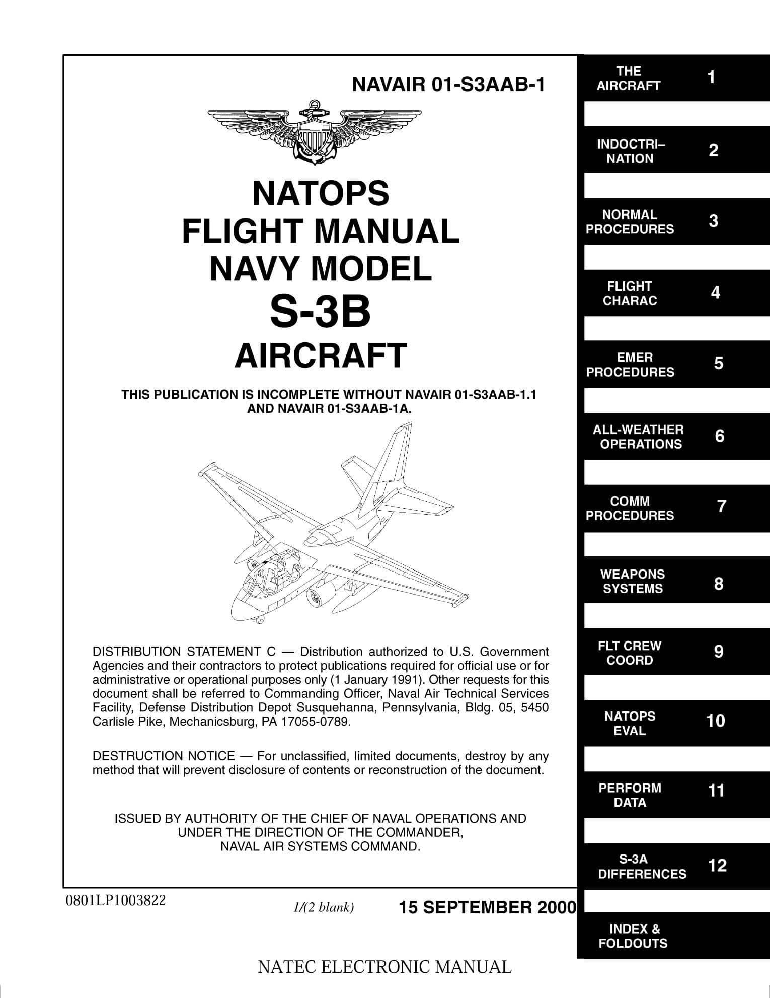- US Navy NATOPS Flight Manual for the S-3B, NAVAIR 01-S3AAB-1, dated 15-9-2000, with approx. 966 pages.