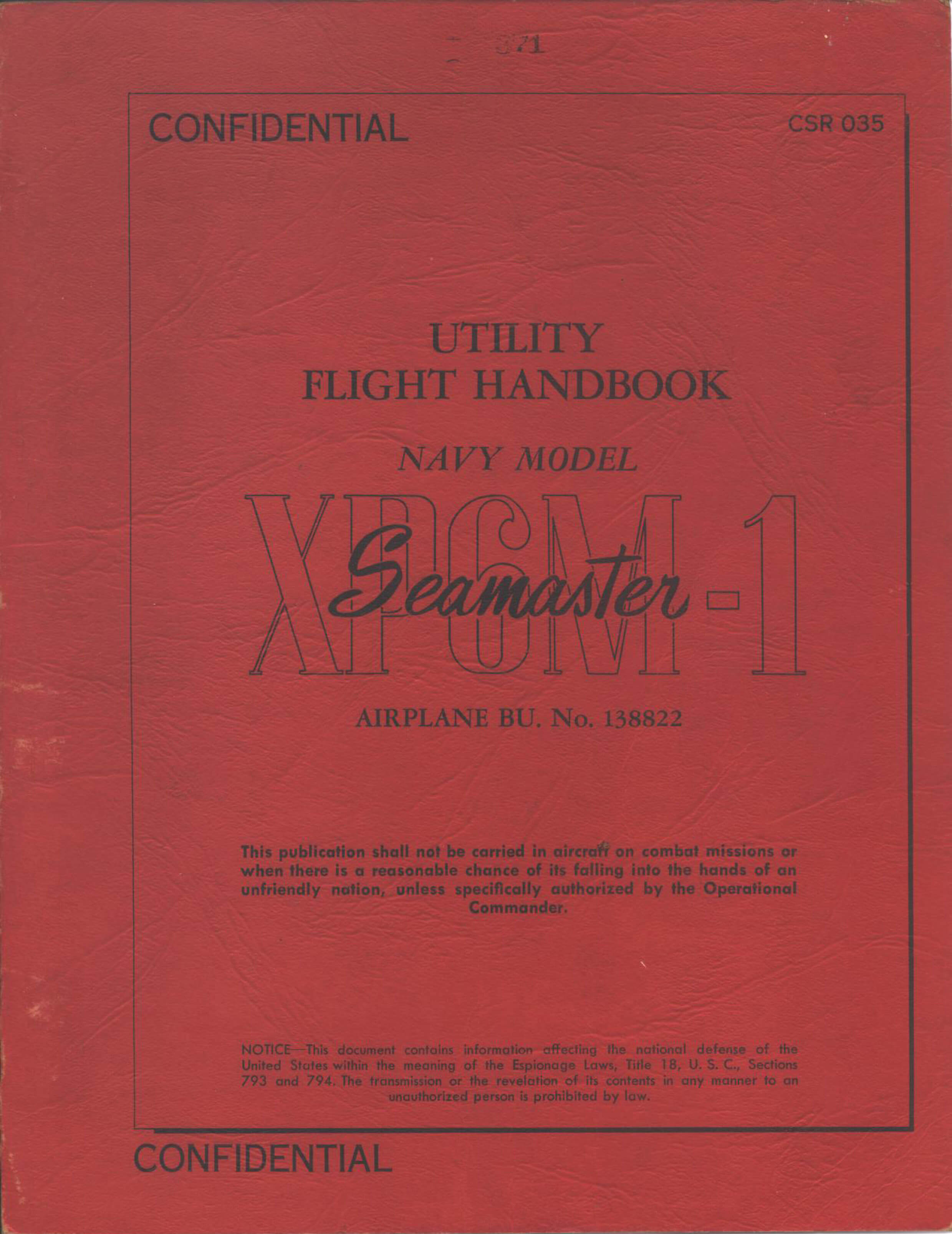 - US Navy Utility Flight Handbook for the Martin XP6M-1 model, Bu No 138822, Report CSR035 dated 1-5-56, with approx. 204 pages.
