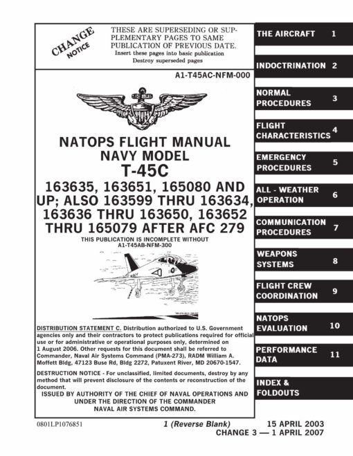 - NATOPS Flight Manual for the T-45C (S/N 163635, 163651, 165080 & up; Also 163599 thru 163634, 163636 thru 163650, 163652 thru 165079 after AFC 279), A1-T45AC-NFM-000 dated 15-4-03, revised to Change 3 dated 1-4-07, with approx. 655 pages.
