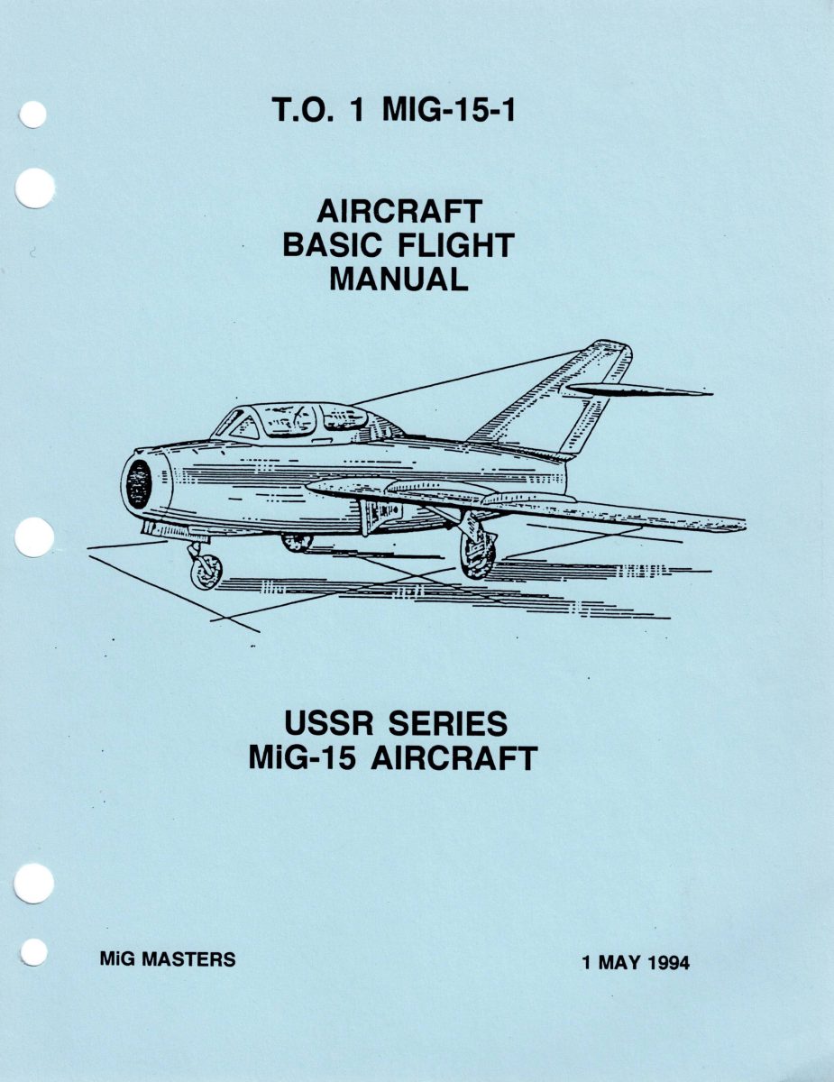 - Flight Manual for the MIG-15, primarily covers the two-seat UTI but includes data for the single seater and differences between aircraft manufactured in different countries. Produced by Mig-Masters, a US company which offered flight training and displayed MIG-15’s in the mid 1990’s. T.O. 1 Mig-15-1 dated 1 May 1994 with approx. 273 pages. Compiled mainly from existing Russian produced manuals. (In English.)